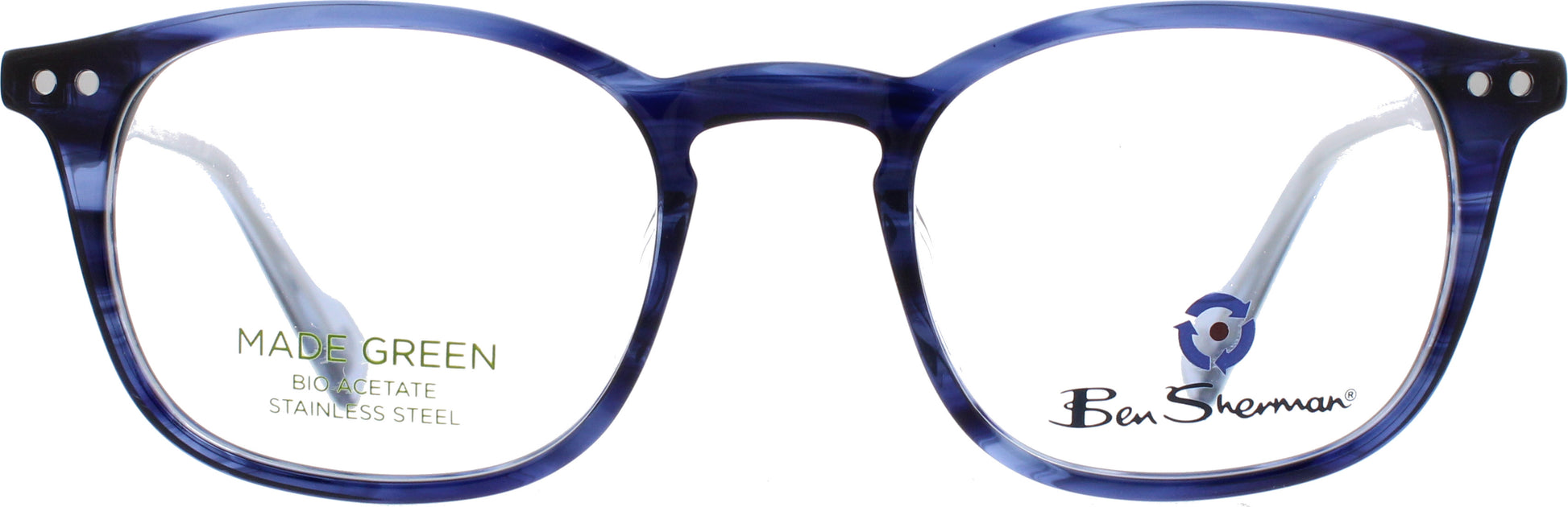 Die Ben Sherman Lawrence vereint britisches Design, nachhaltige Materialien und höchste Verarbeitungsqualität. Die runde Vollrandfassung aus hochwertigem Bio‑Acetat präsentiert sich in einem attraktiven Blau-Marmor-Finish, das jedem Look eine frische, moderne Note verleiht. Perfekt für alle, die eine Brille mit Charakter und urbanem Stil suchen. Die Front aus umweltfreundlichem Bio‑Acetat wird ergänzt durch filigrane Bügel aus Edelstahl, die für Stabilität und ein angenehmes Tragegefühl sorgen. Das Material ist besonders leicht und hautfreundlich.