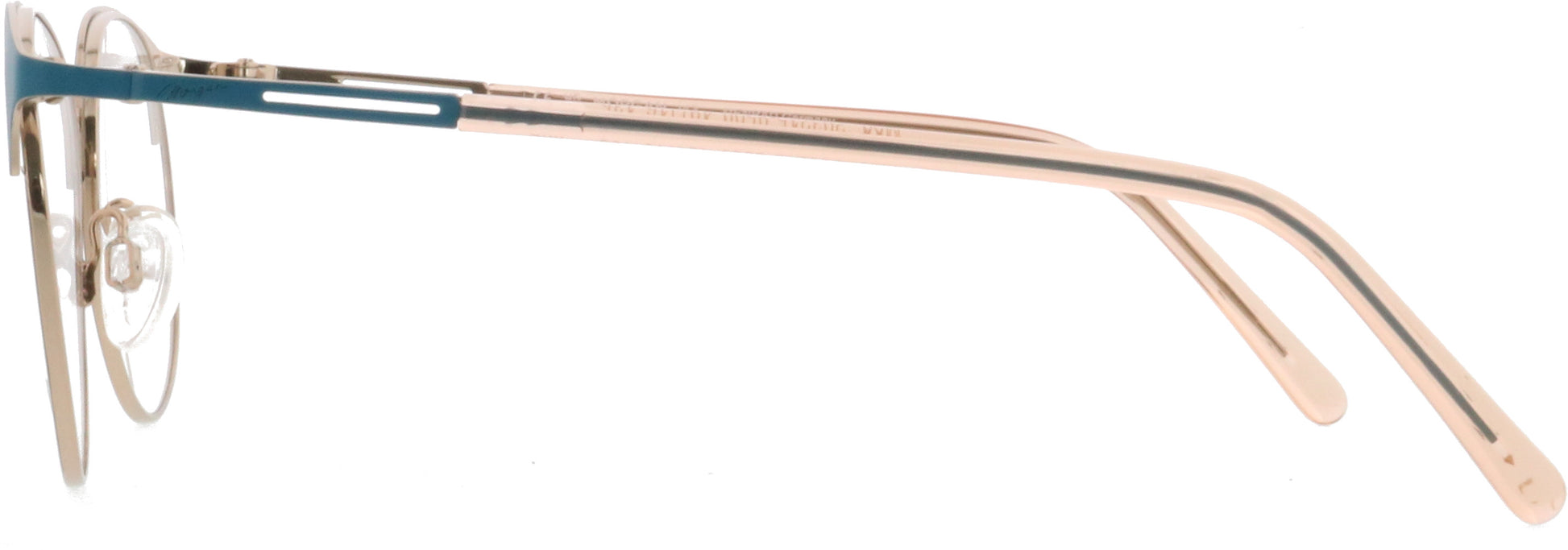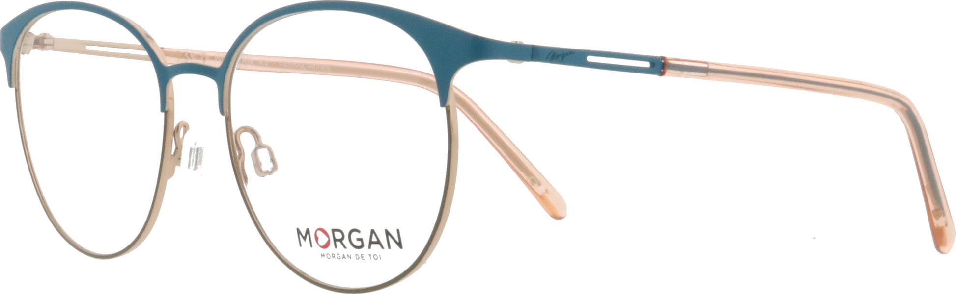 Ovale Damenfassung von Morgan aus dem Hause Menrad in einem schlichten Design. Die Fassung ist türkis und silber mit rosafarbenen Akzenten. Die Bügel sind zum Teil aus Metall mit einem Kunststoffüberzug.
